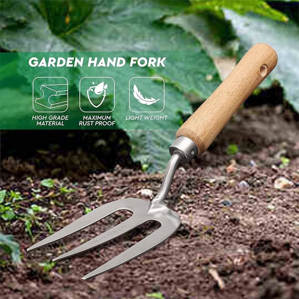 Hand fork designed to loosen soil, remove weeds, and prepare planting beds.